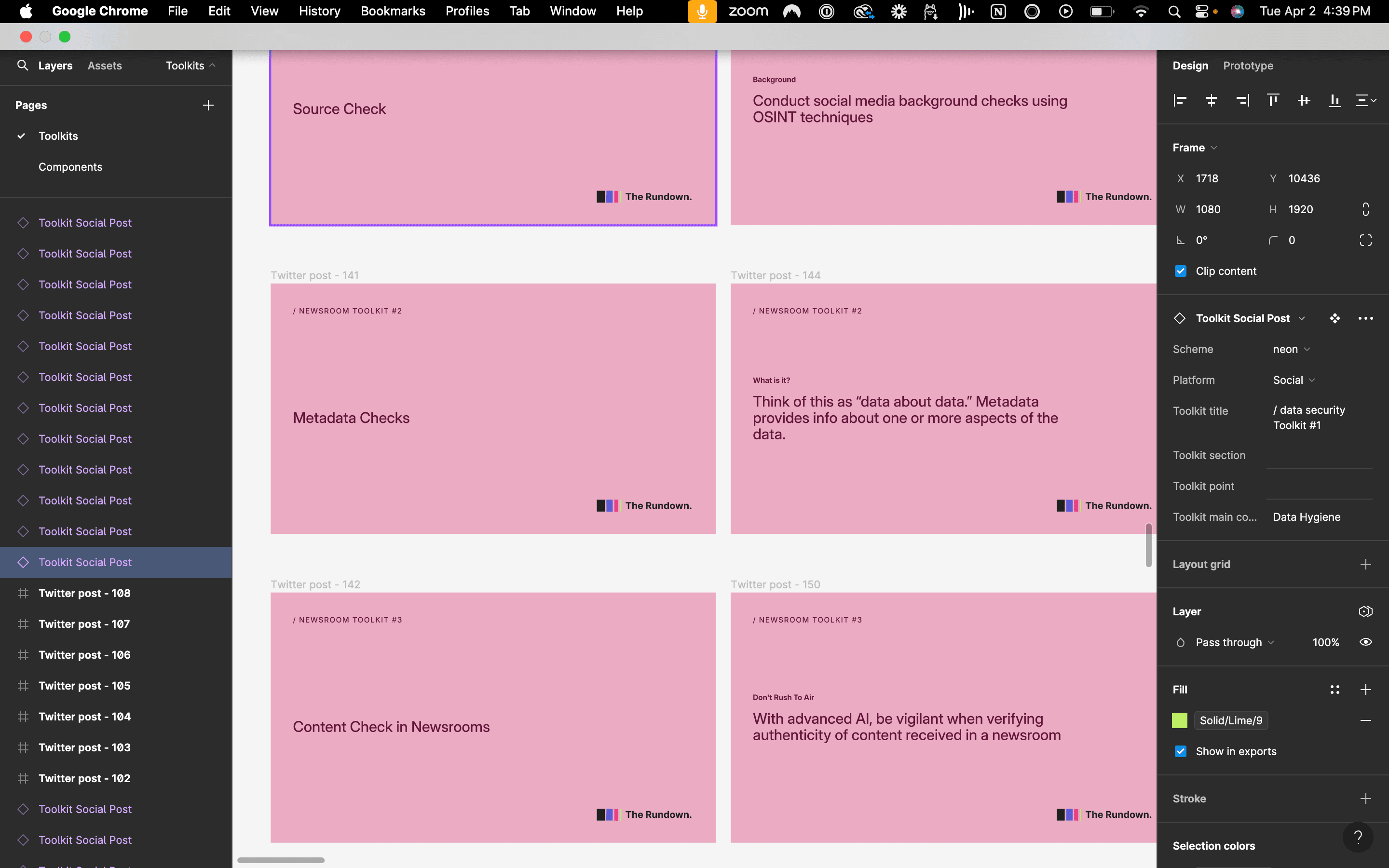 Giving you a sneak peek. We are creating a deck of cards that we hope will be valuable to communications teams and journalists on the go. Here’s a snapshot in Figma of the decks of cards we are calling the “newsroom toolkit.” Here’s a look at the sausage-making process: