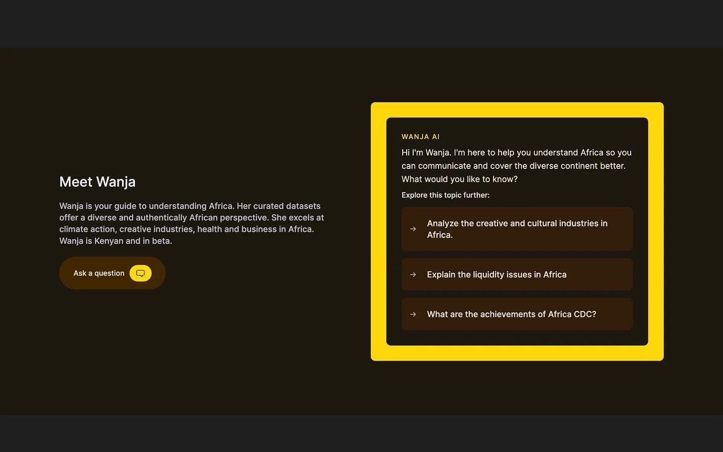 Meanwhile, you can access Wanja now from our site. She’s your guide to understanding Africa. She has only a handful of data sets—health, climate, creative and cultural industries—and curated data sets and conversations around investing in Africa. Her retrieval needs to improve, we know. It means chunking and labelling our data differently. We will work on some fine-tuning as well. You have a limit of 10 questions for now. All feedback is welcome.