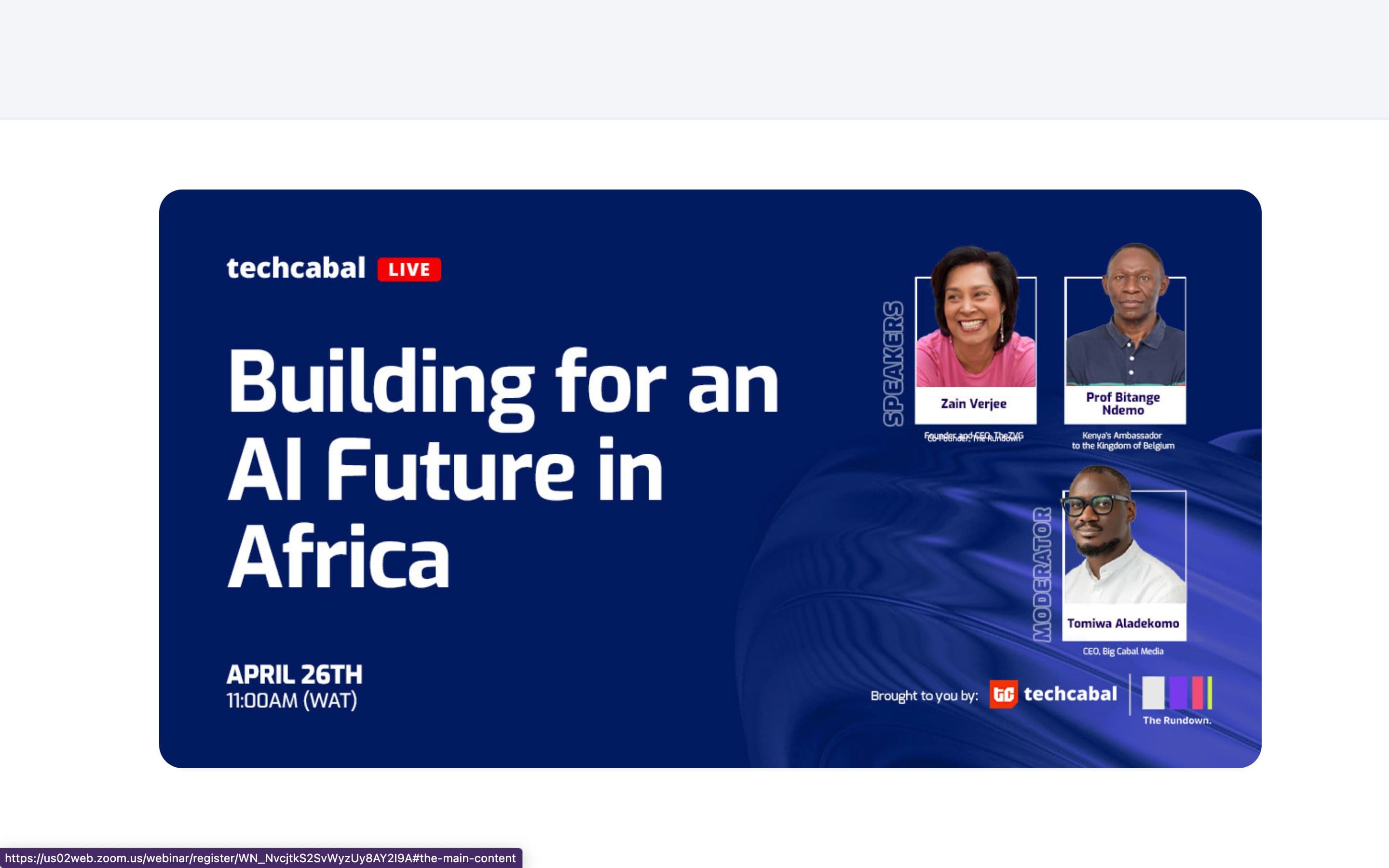 Join us on Friday, April 26th, 2024, for another edition of TechCabal Live, where Tomiwa Aladekomo, CEO of Big Cabal Media, will be speaking with Zain Verjee, co-founder, The Rundown, and Prof. Bitange Ndemo, Kenya’s Ambassador to the Kingdom of Belgium, on Building for an AI Future in Africa. They’ll be addressing how to improve infrastructure in Africa, particularly in data centers, to support the implementation and effectiveness of AI solutions across various sectors.