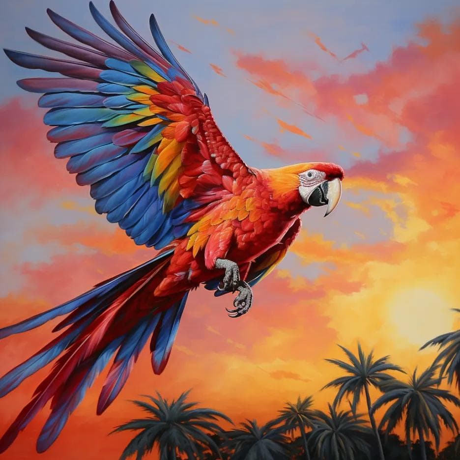 Instead of asking for a “bird”, try something like “Picture a magnificent Scarlet Macaw in full flight against the backdrop of a vibrant tropical sunset. The sky is painted in hues of fiery orange, deep purples, and warm pinks as the sun dips below the horizon. The Scarlet Macaw’s brilliant scarlet plumage is illuminated by the golden rays of the setting sun, creating a striking contrast against the twilight sky. The bird’s outstretched wings showcase a vivid blend of red, yellow, and blue feathers, and its long tail feathers trail gracefully behind, adding to the overall spectacle. The macaw’s beak is open in mid-call, capturing a moment of its majestic flight in this tropical paradise..”