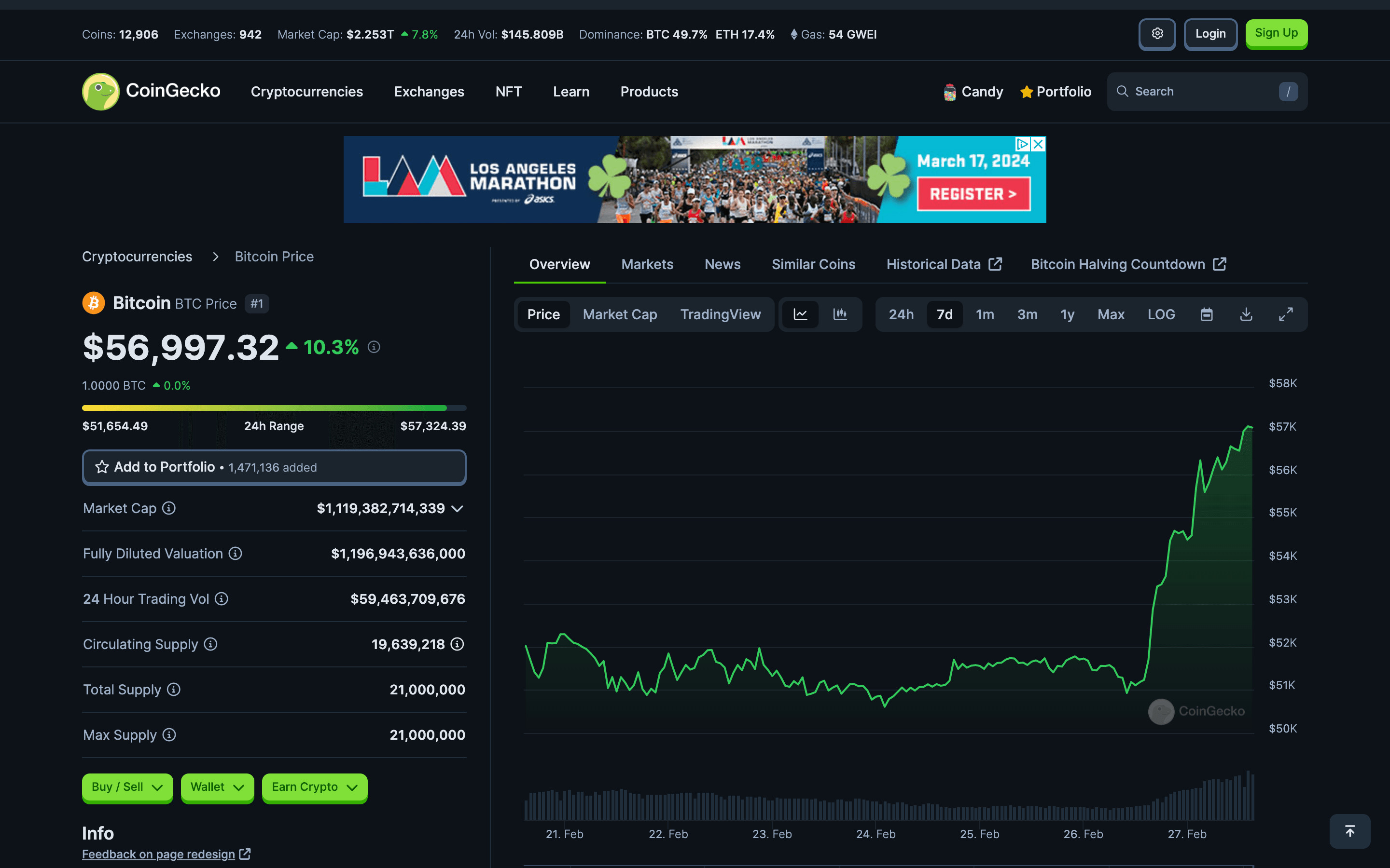 A monster day. Bitcoin is moving at a record pace. At this rate, we could be at 60,000 tomorrow. 58,300 is the next resistance level. The factors include: Supply shock. The ETFs are making a huge difference. Institutional buyers like Blackrock and Fidelity have added billions of Bitcoin in the last few weeks. There’s a set supply of bitcoin. The Bitcoin halving event is coming up in mid-April, which will reduce the supply of Bitcoin in the market. (usually BTC pumps after the halving.)
